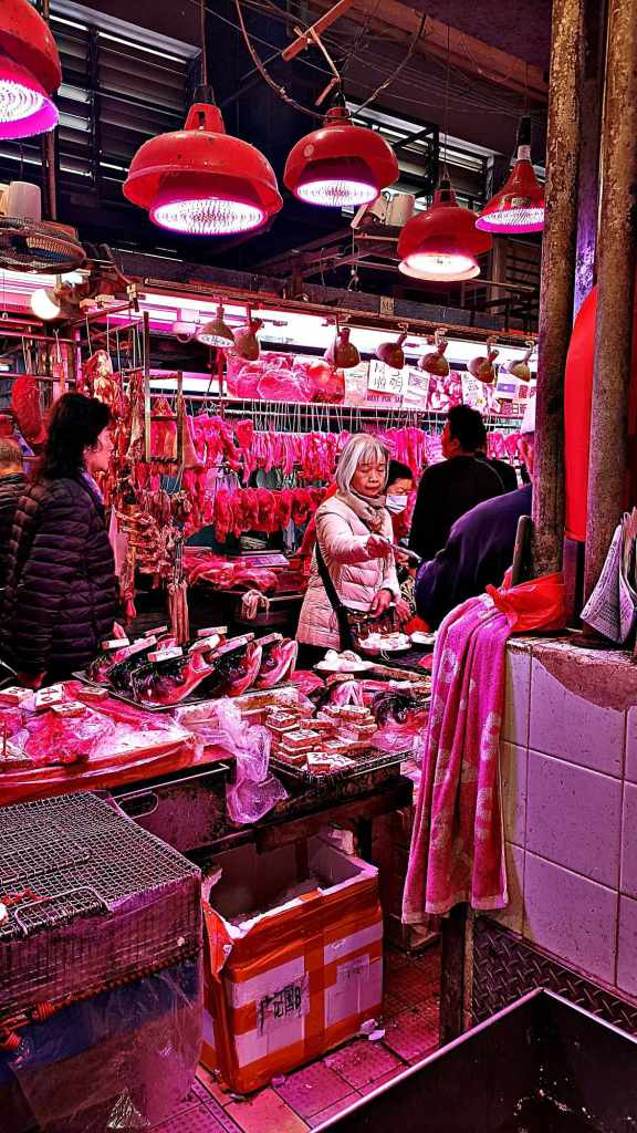 Al piano superiore frutta e verdura, ma anche pollame. Vivo, rumoroso. Qualche gallo pensa bene pure di cantare, in quella confusione. Il tutto, va ammesso, difetta di qualche accorgimento per il benessere animale, ed è qui che la visione occidentale riversa i suoi strali sui cinesi, colpevoli di mangiare qualsiasi cosa si muova e respiri sulla terra, nei mari e in cielo. Eppure, al netto del rispetto delle povere bestie prima di morire immolate alla nostra fame, mi pare che sia un atteggiamento in linea con la natura, col suo ciclo infinito di creazione e distruzione.