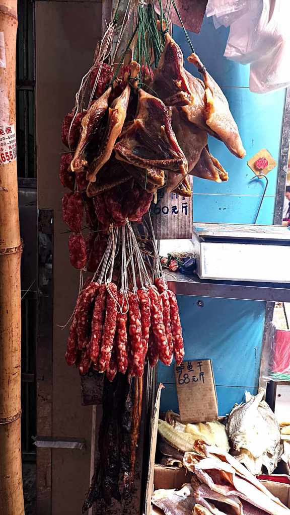 Carni e frattaglie di ogni tipo appese o esposte in piattini, odori e colori per me inconsueti. Pezzi indefiniti di animali appesi nei vari negozietti e nei banchi del mercato. Di che animali si tratterà? E poi le onnipresenti anatre: arrostite, essiccate? Non lo capisco. Presenti non solo al mercato e nelle rosticcerie, ma appese anche nei ristoranti locali.