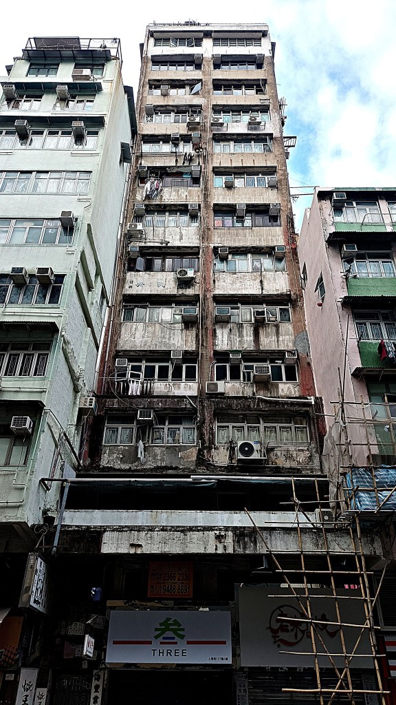 Quando lasci l’arteria principale e ti inoltri nelle strade secondarie, tra negozi, bancarelle e folla, alzando gli occhi verso gli edifici circostanti, scorgi facciate che portano il segno della stratificazione. Guardando questi scorci del paesaggio urbano, mi viene in mente l’ossimoro “armonia caotica”. Ancora quelle torri fatiscenti, ancora quel clima. E gli edifici più brutti, nella relatività del giudizio – lo ripeto ancora una volta – sono i più belli perché i più espressivi, che parlano della vita della città. Blocchi di cemento e torri sottili di qualche decina di piani, con facciate in cemento scolorito, grigio o marrone, qua e là scrostati, anneriti, butterati di macchine per l’aria condizionata. A fianco, una selva di bambù e di teli verdi, l’impalcatura da cantiere usata a Hong Kong, rende le strade una foresta urbana. E poi le insegne, stracolme di caratteri cinesi tradizionali, che aumentano il bellissimo senso di “intreccio”, della nostra “armonia caotica”.